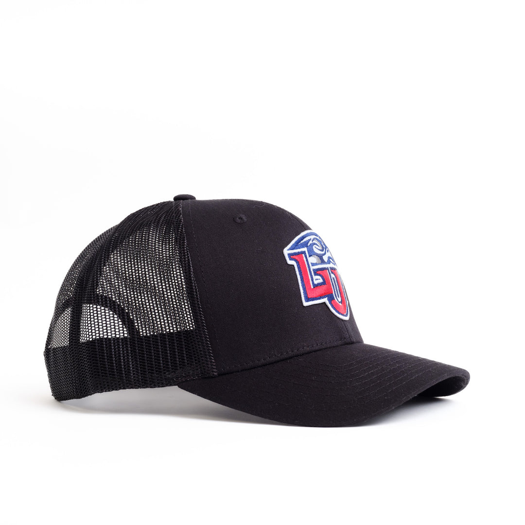 This is a structured hat with six panels and a black mesh backing. The trucker stye makes this hat super breathable and helps prevent sweating. The embroidered patch on the front shows the LU logo with the iconic eagle. Likewise, it looks awesome against the stark black hat color.
