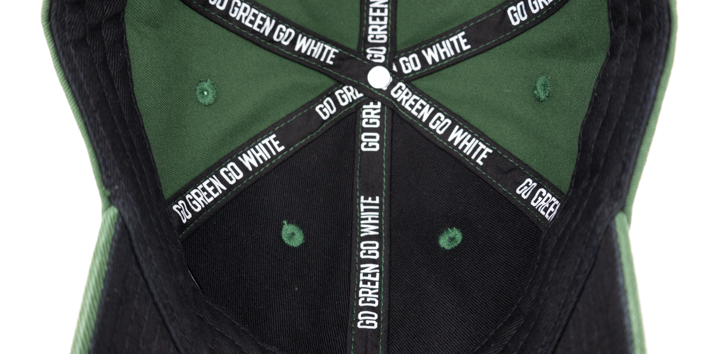 Inside, the hat is fully custom: “Go Green Go White” seam tape stitched in green, a moisture-wicking sweatband, and a soft black cotton twill liner that covers the embroidery stitching for added comfort. A black underbill adds a subtle, stylish contrast, while the adjustable brass buckle gives it a perfect, personalized fit.
