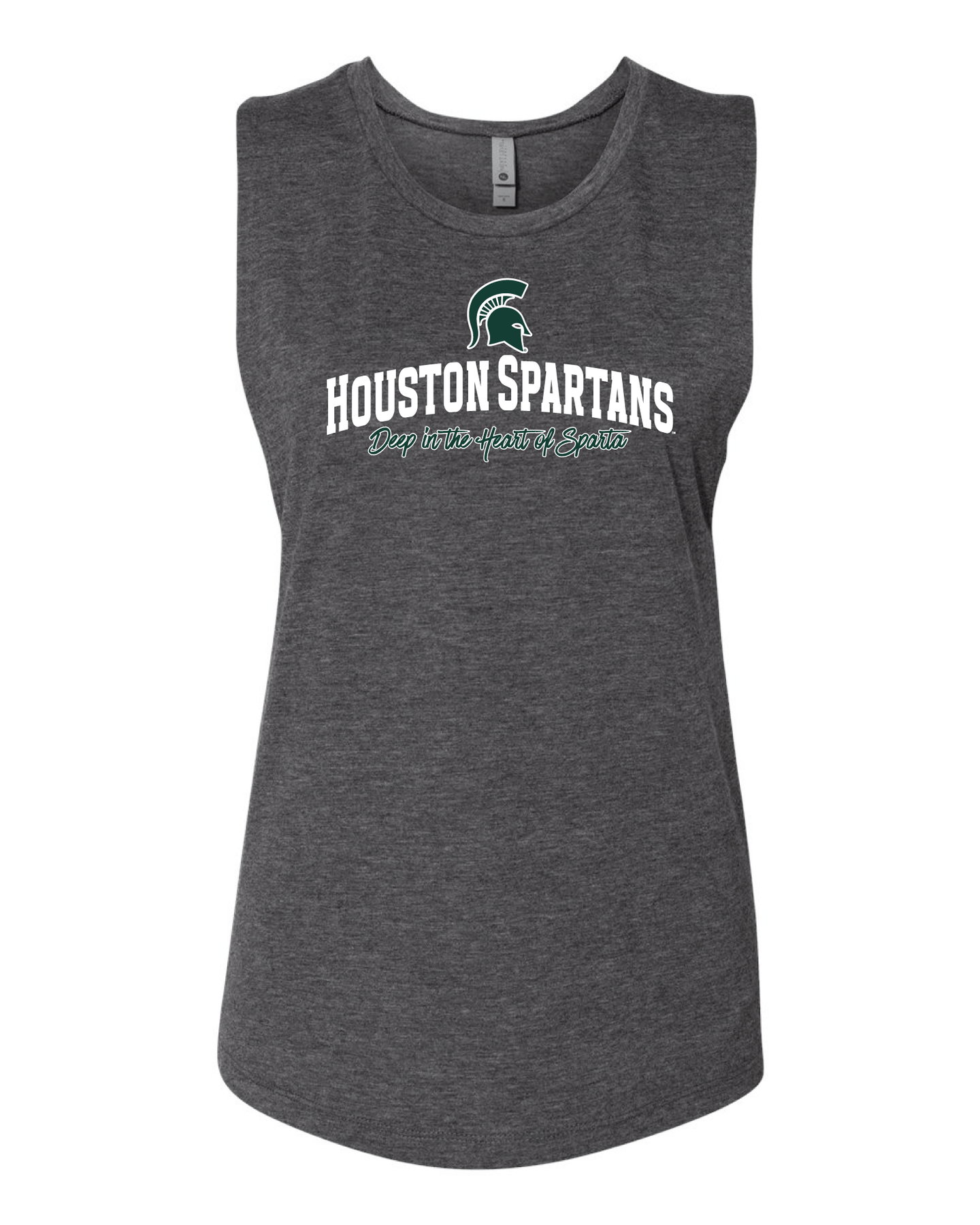 The relaxed muscle fit and oversized armholes make this a flattering and functional piece for layering over a sports bra or pairing with high-waisted shorts on a hot day. The front graphic features the iconic Spartan helmet above bold "Houston Spartans" text, with the phrase “Deep in the Heart of Sparta” tying it all together for that perfect Texas twist. Whether you're hitting the gym, heading to a watch party, or just enjoying the sun, this tank is ready to keep up.