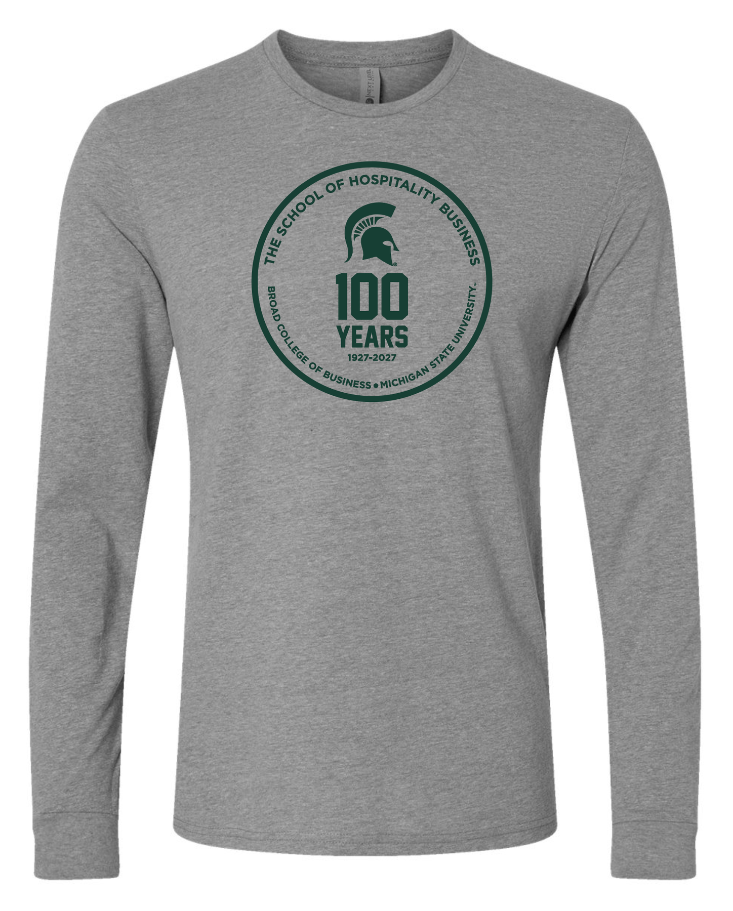 Celebrate 100 years of excellence in Michigan State University’s School of Hospitality Business with this special edition long sleeve shirt. Designed to honor the program’s rich history, this tee proudly displays the official centennial logo, making it a must-have for students, alumni, and MSU supporters.