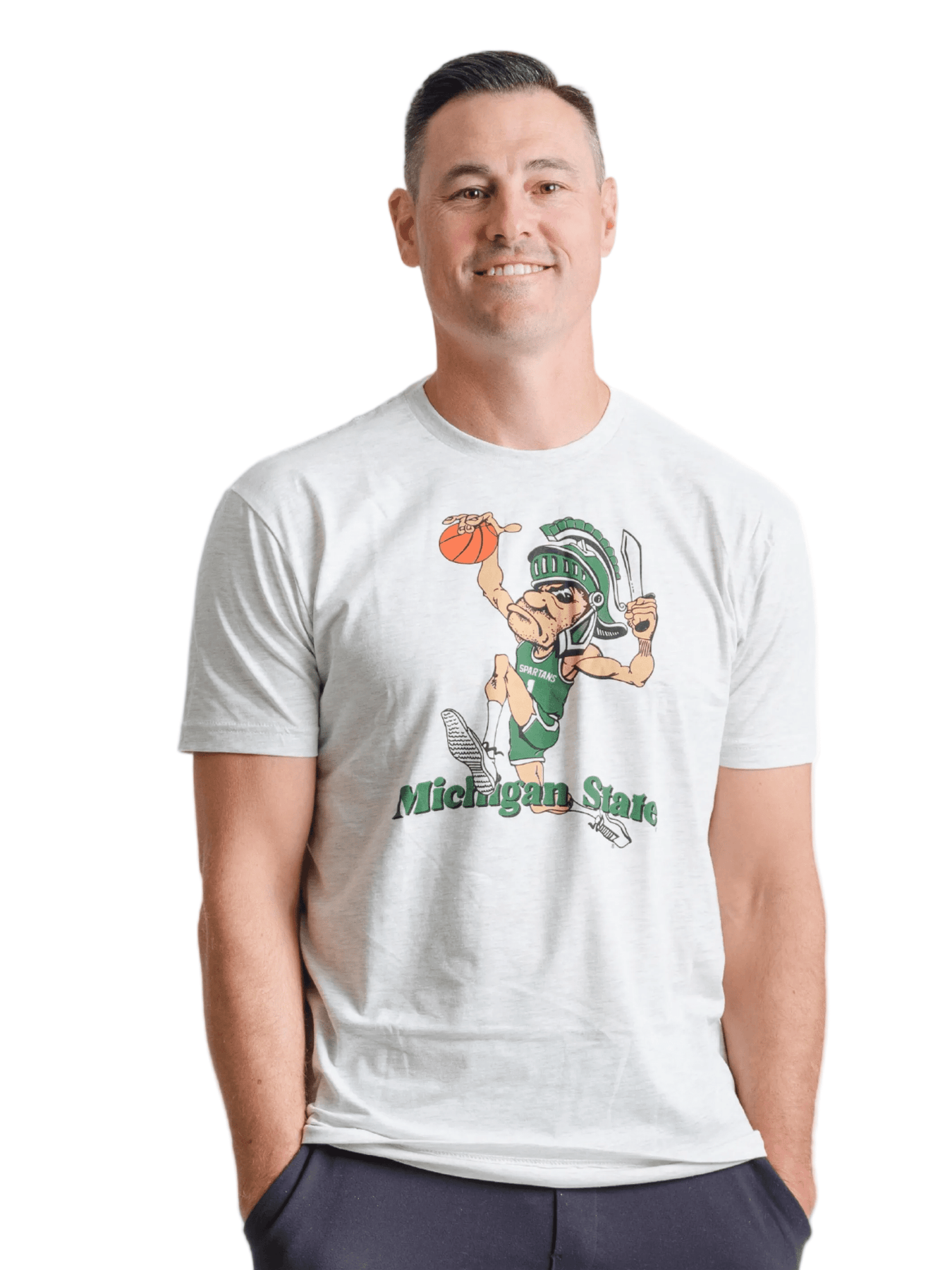 Bring the heat to every MSU sporting event with this one of a kind Dunking Gruff Sparty Shirt. The design features Gruff Sparty jamming a basketball through the rim with “Michigan State” running through his legs, creating a bold, nostalgic look that feels straight out of a classic era of Spartan hoops. Printed in green, white, orange, and tan ink on an off white shirt, the vintage color palette gives it that perfectly worn in, retro vibe fans love.