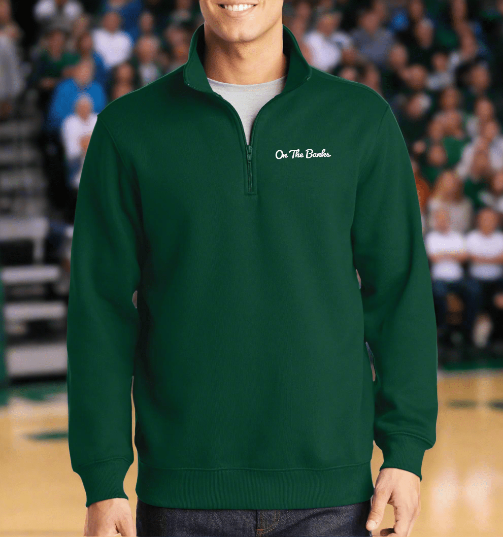 Stay stylish and comfortable in this green quarter zip featuring “On the Banks” embroidered in crisp white thread on the left chest. With its classic design and premium fabric blend, this quarter zip is perfect for layering or wearing on its own.