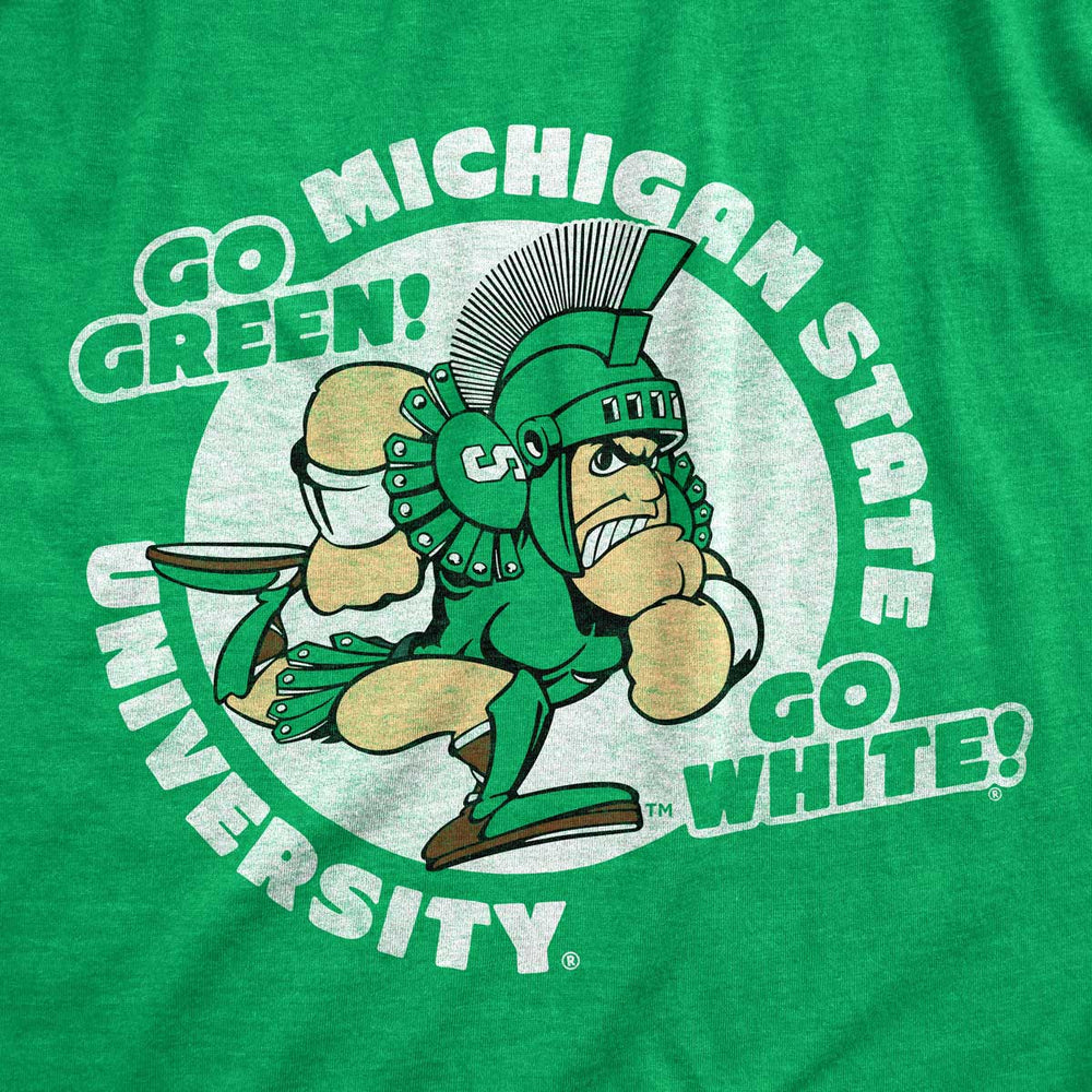 The Kelly Green hue of the shirt is a testament to the school's history, vibrant identity, radiating energy and enthusiasm. Crafted from premium quality fabric, it guarantees utmost comfort, making it ideal for wearing to games, classes, or simply displaying your Spartan pride wherever you go. Whether you're a student, alumnus, or an avid fan, this shirt encapsulates the essence of what it means to be part of the Michigan State University family. Wear it proudly, and join the ranks of those who bleed green and white, standing together celebrating Spartan pride and excellence.